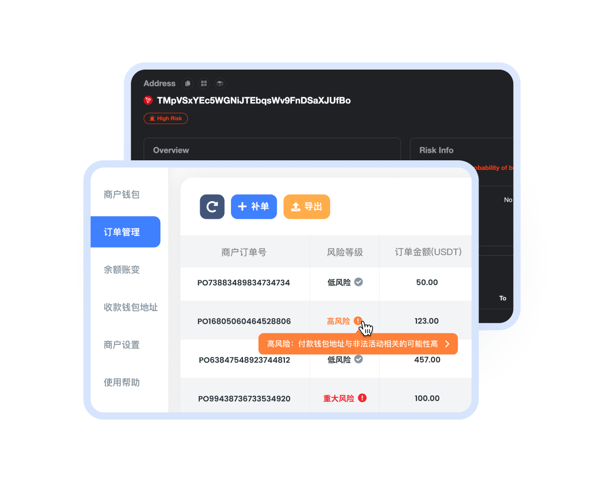 实时监控和识别风险有风险的付款地址,避免您收到黑 U、标记 U 等风险资产。风险等级分为无风险、低风险、中风险、高风险、重大风险,实时为您的收款保驾护航。